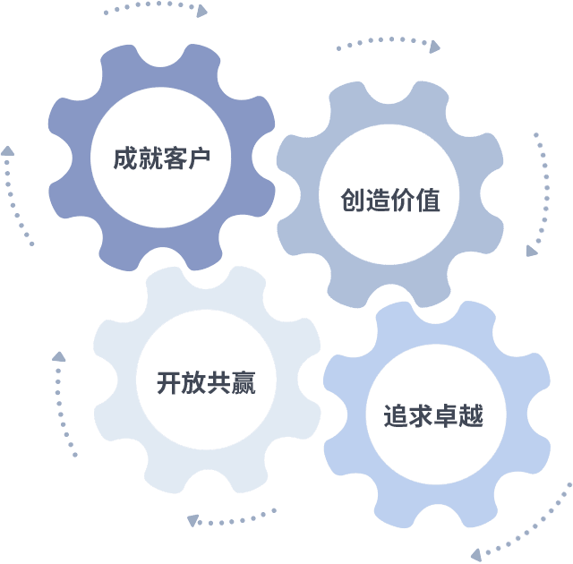 成就客户是一切决策的出发点,,,,创造价值是衡量所有工作的标准,,,追求卓越是CMD368体育做事做人的态度,,,,开放共赢是CMD368体育的格局也是最终的结果。。。。价值观的齿轮环环相扣,,推动着组织里的每个人不断向前。。